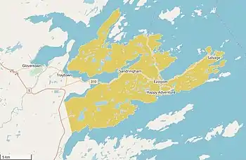 The Eastport Peninsula is a small extension of land into the central part of Bonavista Bay in the Canadian province of Newfoundland and Labrador. The peninsula is adjacent to Terra Nova National Park and contains seven small communities: Eastport, Happy Adventure, Sandy Cove, Salvage, St. Chad's, Burnside and Sandringham.