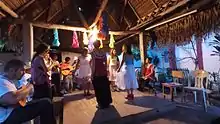 The band Las Cafeteras got their start at the Eastside Café, citing the organization's weekly son jarocho classes as an important part of their musical formation.[5] The band learned to play instruments central to the son jarocho Afro-Mexican folk music style from Veracruz, Mexico - including the jarana, requinto, quijada, and tarima.[7] The seven members also learned zapateado at these classes, a rhythmic dancing style from Mexico punctuated by percussive footwork.[5]