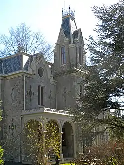 The masonry building is two-and-a-half stories, with a three-story tower. The main roof is mansard, with slate covering. The house features three porches and four stone chimneys. The original architecture has been attributed variously to Joseph C. Hoxie (1814–1870) and Samuel Sloan.