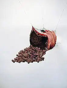 Patterson's early work often revolves around questions of identity and the body, and takes the form of mixed media paintings, drawings and collages, most of them on paper. Photography, found objects, installation and performance have recently become increasingly important in her practice. Early work was primarily concerned with the female body as object. Her Venus Investigations objectified the female torso, headless and anonymous, and explored the relationship between the ample-bodied "Venus" or female goddess images of prehistoric times and contemporary female self-images and beauty ideals. Subsequent works more provocatively focused on the vagina as an object and, by implication, examined the taboos that surround this body part and its functions within Jamaican culture. This also led to 3-dimensional constructions made from intimate female articles such as sanitary napkins and tampons and more abstracted and surreal hybrid organic forms that appeared in her large paper collages of 2007. This early body of work has a sober and at times even majestic visual beauty which as she puts it, references "beauty through the use of the grotesque but visceral, confrontational and deconstructed."[10] Patterson's artwork often addresses social and political issues related to feminism, violence, gender identity, and sexuality. Her work has been exhibited at art galleries around the world and has been critically acclaimed for its powerful messages.