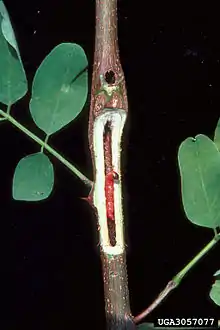 The larvae feed on Robinia pseudoacacia. The larvae feed within the stem pith of seedlings, stump sprouts and new stem growth of older trees.