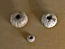 Echinopsis from Sudan, perforated specimen to be threaded. On display at Galerie de paléontologie et d'anatomie comparée in Paris