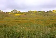 California's Central Valley was once a large temperate grassland containing native bunchgrasses and vernal pools.[12] Grizzly bear, gray wolf, tule elk, and pronghorn antelope used to inhabit the grasslands.[13] The native grasslands and pools have now been largely replaced by livestock ranches and farms.[14] The Carrizo Plain, where the native grass is preserved, is referred to as the "Serengeti of California".[15]