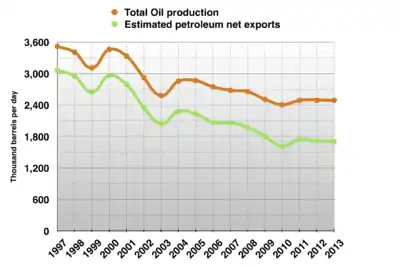 Venezuela is a major producer of oil products, which remains the keystone of the Venezuelan economy. Under the Chávez government, crude oil production decreased from 3.12 million barrels a day when Chávez took office in 1999, to 2.95 million barrels a day in 2007,[10] whilst oil prices increased 660%. Stephen Randall, Director of the University of Calgary's Latin American Research Centre, points out that during Chávez's years in power Venezuela increased its dependency on oil exports to 95% (2012) from 80% when he took power in 1999.[11] Furthermore, before the financial crisis in 2008 Venezuelan oil was selling at $129/barrel. It then dropped to $43/bbl by March 2009. Instead of reining in spending Chavez responded to reduced revenues by introducing more exchange controls and continuing with nationalizations. A 2014 article by CNBC stated that under Chávez, oil production declined from 3.5 million barrels per day to 2.6 million barrels per day, though Venezuela only made a profit from 1.4 million barrels per day due to Venezuela giving large amounts of its oil away for free.[12] CNBC continued stating that though oil production decreased, public spending increased to over 50% of the GDP, spending more than received in oil profits which led to foreign loans that amounted to over $106 billion as of 2012.[12] Foreign investment flows by the end of his presidency in 2013 were half what they had been in 1999.[11]