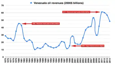 High oil prices in the 2000s not seen since Venezuela's economic decline in the 1980s were a main factor for Chávez's initial successes.[1]