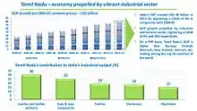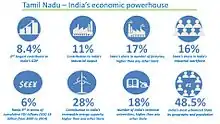 Tamil Nadu has the second largest state economy in India.[16] The state is 48.40% urbanised, accounting for around 9.26% of the urban population in the country, while the state as a whole accounted for 5.96% of India's total population in the 2011 census.[17] Services contributes to 54% to the gross domestic product of the state, followed by manufacturing at 33% and agriculture at 13%.[18]