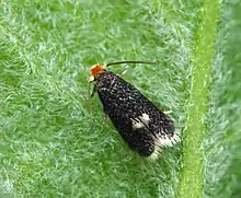 The wingspan is 5–6 mm. The head is ferruginous to ochreous with a whitish collar. Antennal eyecaps whitish. Posterior tarsi whitish. Forewings dark fuscous, somewhat pale-sprinkled and with a subtriangular whitish tornal spot ; tips of apical cilia whitish. Hindwings grey.[1] Adults are on wing in May and June and again in August.