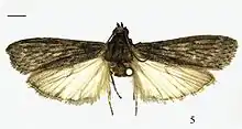 The wingspan is 25−30 mm. The forewings are dark greyish brown with some white powdering and black along the veins. The antemedial line is invisible, and the discal spots are blackish brown and separated. The postmedial line is faint, greyish white, and serrated, gently curved inwardly from the costal one-fifth to the dorsum at one-fifth. The terminal line is black and interrupted. The hindwings are greyish white, and light brown along the costa and veins.