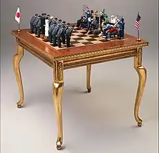 Checkmate (1992), a.k.a. Ōte in Japanese, continued Massey's social critiques. Sculpted on a gilded chessboard, on one side are disparate Americans including lazy students, a jobless man, in-fighting employees, and scrambling scientists who are "losing to the disciplined and homogeneous Japanese,"[3] posed as the opposing threat. A stereotypical sentiment of the era, Massey's creation moved the dialog needle forward in a Tokyo Broadcast System 2-Part Special.[7]