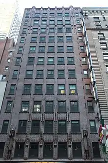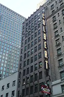 The office building lobby has terrazzo-and-marble floors; plaster wall panels with marble wainscoting; a bronze mailbox; a plaster vaulted ceiling. Four elevators lead from the office lobby to the upper floors, and a stair with a cast-iron balustrade also leads up from the office lobby.[14] The office stories were designed with high ceilings and column-free spaces.[20] Each story was originally arranged with a narrow elevator vestibule, which has been replaced on most floors. The office stories were otherwise decorated in a utilitarian fashion.[14] Arthur Hammerstein reportedly kept a bar room in his office.[21] Among the tenants of the office stories are the Mayor's Office of Film, Theatre & Broadcasting,[22] a New York City government agency on the sixth floor.[23]