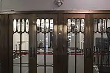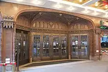 The outer lobby is L-shaped and has Gothic design details.[26] As in the vestibule, the outer lobby's marble floor has a rhombus pattern, while the walls have marble baseboards and cast-stone panels.[27] The north and south walls are each divided into three bays, with pairs of piers projecting from either wall. The center bay of the south wall has a three-sided ticket booth, while the westernmost bay on the south wall leads into the inner lobby of the auditorium.[28] The ticket booth projects outward and contains cusped arches with windows, surrounds with Gothic details, and finials.[14] The north wall has cast-iron radiator grilles as well. The west wall contains metal double doors with Gothic tracery, which lead to a service alley, while the east wall contains doors from the entrance vestibule.[27] The ceiling contains transverse ribs, which rise from columns along the north and south walls, dividing the ceiling into coffers. Within each coffer, there are moldings with foliate decoration, as well as rosette bosses.[29]