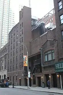 The 53rd Street elevation is divided into three parts from east to west: the office section, the auditorium exit, and a seven-story auditorium facade. The office section to the east is six bays wide and 13 stories high, with the windows on each story being grouped in pairs. The ground story contains a storefront and an entrance to the Ed Sullivan Theater's office lobby, while the top stories contain Gothic ornament.[4] The auditorium exit at the center is three stories high and contains burned stretchers between the red brick. The second story of this section has a fire escape and an arched window. The third story contains a brick pattern with pulled-out bricks, as well as vertical stretchers that are arranged to resemble piers.[9] The auditorium facade at the west is seven stories high, with six window openings on each story.[14] An electrical substation for the New York City Subway exists immediately west of the auditorium.[15]
