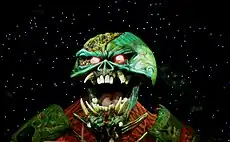 Eddie (also known as Eddie the Head) is the mascot for the English heavy metal band Iron Maiden. He is a perennial fixture of the group's artwork, appearing in all of their album covers (as well as most of their singles) and in their merchandise, which includes T-shirts, posters and action figures. On top of this, Eddie features in all of the band's concerts, as well as in the first-person shooter video game, Ed Hunter, the mobile game, Iron Maiden: Legacy of the Beast and a pinball game with the same name in 2018.[1]