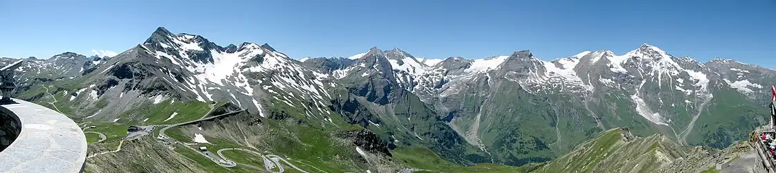The Edelweißspitze is a summit in High Tauern, located in Salzburg, Austria north of the Alpine divide. It can be accessed by car from Edelweißstraße, a branch-off from Grossglockner High Alpine Road, starting from Fuscher Törl and is the highest-accessible point of the road. Originally, its height was 2577m before building the parking lot and was named Poneck, Leitenkogel or Bergerkogel.[1] It serves as a scenic viewpoint of the High Tauern National Park with views to summits of the Glockner Group. In north-west direcetion, there is a hut which includes a restaurant.