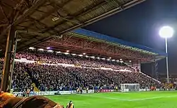 It currently holds 2,411 and is occasionally given to larger away supporters, if seats are not required by home supporters. There are toilets and refreshment facilities on a small outdoor concourse behind the stand, which backs onto a small reservoir. As with the Main Stand opposite, the roof is supported towards the front by several steel columns; their thickness and location are partly explained by the fact that when the current roof was built, in 1956, it had to be erected in front of an existing roof, which covered only the rear part of the then much deeper and higher terrace.