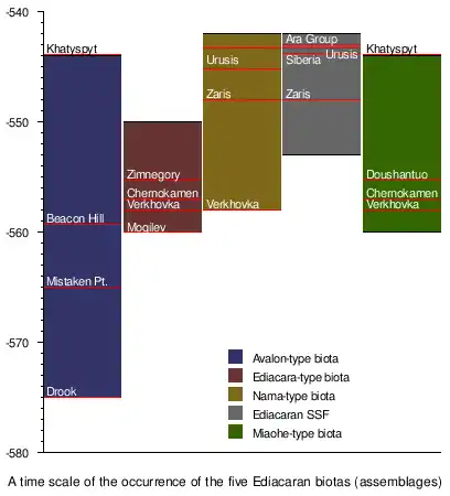 151. 1 2 3 4 5 6 Grazhdankin, Dima (2004). "Patterns of distribution in the Ediacaran biotas: facies versus biogeography and evolution" (PDF). Paleobiology. 30 (2): 203–221. doi:10.1666/0094-8373(2004)030<0203:PODITE>2.0.CO;2. S2CID 129376371. (Source of data for Timeline synthesis, p. 218. Further citations available in caption to Fig. 8.)