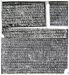 Edilpur Copperplate (Bengali: ইদিলপুর তাম্রলিপি) was found in a char land dug of Edilpur zamindari under Shariatpur District of Bangladesh about 120 miles directly east of Calcutta. Baboo Conoylal Tagore of Tagore zamindari has presented the plate to Asiatic Society of Bengal in 1838, but now it is missing from collection. The plate is made of copper and was sharp in the letters, that the plate could have been long buried in the place where it was found. There was a seal, which is an elaborately executed figure of Siva in copper cast.[1] The character of this inscription is rather less simple than the earlier alphabets of Pala dynasty. It is strictly the Gaur character which has descended the modern written Bengali. It is much to be regretted that when the first a font of Bengali type was prepared, the letters were made after the model of the running hand or written instead of this which may be called the print hand.
