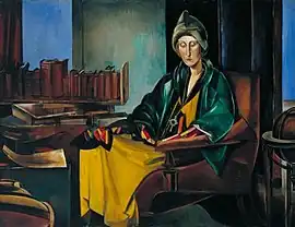 Wyndham Lewis' portrait shows the British poet and critic Edith Sitwell seated with half-closed eyes and with bookshelves in the background. Sitwell, who came from the aristocratic Sitwell family, was part of a cultural elite,[1] and the setting of the painting suggests learning and literature. The picture is stylised in a way influenced by Futurism, but shows Lewis' ambition to go beyond Futurism. It has similarities to a more abstract portrait Lewis painted in 1920, titled Praxitella. The art critic Paul Edwards says it seems to follow the dictum laid out in Lewis' novel Tarr (1918), which "explains that works of art have no 'inside', no 'restless ego' living in their interior, having instead a kind of 'dead' version of living through their forms and surfaces alone".[2]