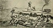 Hanssens reached Équateurville on 17 April 1884 with the three steamers and six Europeans, Wester, Amelot, Drees, Guérin, Courtois and Nicholls.[5] He found that Alphonse van Gèle and Camille Coquilhat had made it into a model station.[1] At the suggestion of Van Gele and Coquihat, Hanssens interrupted his journey to explore the mouth of the Ubangi River He left in the En Avant on 19 April 1884 with Van Gèle, Courtois, Guérin and Amelot, ten Zanzibaris and one local African as an interpreter.[5] Going downstream the steamer skirted the right bank of the Congo River, but was carried by the current into a maze of islands. After three days they saw some native fishermen in a canoe.[6] Van Gèle managed to persuade them to act as pilots, and after four hours of full steam on 21 April 1884 entered a strong stream of yellow water, the Ubangi, which they ascended to the Bisongo village. They received a friendly reception, and Hanssens exchanged blood with Chief Mkoko.[7] The chief agreed to place both banks of the Ubangi[lower-alpha 1] under the protection of the International Association of the Congo. After returning to Equateurville Hanssens left Van Gèle in charge and took Coquihat with him to found the Bangala station, the future Nouvelle Anvers.[9]