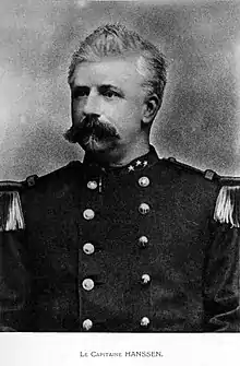 Edmond-Winnie-Victor Hanssens was born in Veurne, Belgium on 25 July 1843. He entered the École Militaire (Military School) on 1 March 1860 and was appointed second lieutenant on 22 March 1862. He was posted to the 11th line regiment. On 3 July 1867 he was appointed lieutenant. He entered the École de Guerre in 1871 and obtained the certificate of deputy état-major in 1875. He was promoted to captain in 1876, and became a tutor of the military art course at the École Militaire.[1]