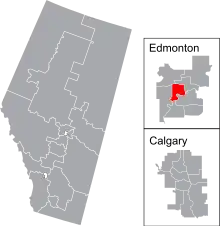 The riding is anchored in the heart of Downtown Edmonton. It also includes Spruce Avenue, Rossdale, Central McDougall, Prince Rupert, Oliver, Queen Mary Park, Westwood, Prince Charles, Sherbrooke, Dovercourt, Woodcroft, Inglewood, Westmount, North Glenora, Glenora, McQueen, Grovenor, Gagnon Estate, Canora, High Park, Crestwood, Jasper Park, Parkview, Laurier Heights, Lynnwood, Patricia Heights, Rio Terrace, and Quesnell Heights.