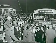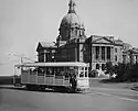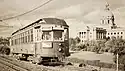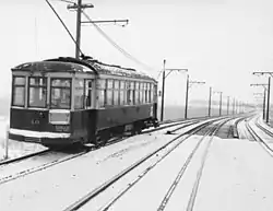 On September 1, 1951, Edmonton streetcar No. 1 – one of the first two streetcars ordered by Edmonton – performed a ceremonial 'last run' across the High Level Bridge at around 8:00 PM.[1] It carried Mayor Sidney Parsons and other invited guests from Jasper Avenue and 97 Street, to the loop at 84 Avenue and 109 Street.[1] A number of the dignitaries on board took turns driving No. 1, including Lieutenant Governor John J. Bowlen, who had once been a Conductor in Boston's street railway system. From there, they took a bus to the opening ceremony for the new Strathcona bus garage, which was built at a cost of $500,000.[5] Around 1,000 people watched the streetcar trip, which marked the closure of the Edmonton's streetcar system.[5]