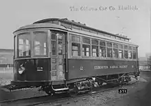 The ERR's name stemmed from its radial, or "out-and-back", model; all streetcar lines converged at Jasper Avenue and 101 Street, and radiated outward to various areas of the city. Shortly prior to the start of service, Edmonton purchased the Strathcona Radial Tramway Company Ltd. for $135,000, thus gaining the ability to provide streetcar service to the City of Strathcona as well.[1] Regular service commenced on November 9, 1908, with a fleet of four streetcars operating on 21 kilometres (13 mi) of track.[3]
