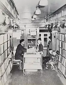 The ERR tried to find ways to help improve the spirits of local residents during the war. Librarian H.C. Gourlay proposed the introduction of a library car, and streetcar No. 14 was converted into a mobile library to serve residents in outlying neighbourhoods.[6] The royal blue streetcar, which had a capacity for 2,000 books and was fitted with wooden bookcases that were secured to its walls, entered service in October 1941.[6] The ERR constructed short sidings in certain neighbourhoods so that the streetcar could park without blocking transit services.[6] On its first day of service, 700 residents visited it in Calder; more than half of them were first-time borrowers, and three quarters were children.[11] By early December, 1941, the streetcar library lent more than 9,500 books, and signed up over 4,000 adults and 1,000 children with new library memberships.[11]