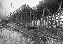 The morning of October 22, 1919, saw residents unexpectedly contending with snow and freezing temperatures.[5] As streetcar No. 21 approached the bridge spanning a ravine at 132 Street, which only had one streetcar track, Motorman McLennan slightly applied the brakes.[5] Snow and ice were compacted into piles by the skidding wheels, causing the streetcar to leave the track and lurch over the right-hand side of the bridge.[5] The streetcar fell 10 metres (33 ft) down the ravine, and landed on its roof.[14] McLennan and his five passengers all survived, but received various injuries — ranging from scratches and bruises, to fractured ribs and a broken sternum.[14] Four factors played a large role in their survival: The streetcar fell just over half the total depth of the ravine, the trucks—which were among the streetcar's heaviest components—detached before it landed, its sides caved outward instead of inward, and the frame stopped the roof from caving in.[14]