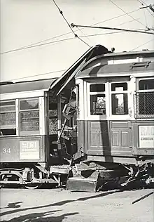 On December 6, 1930, Motorman Clarence Ostrander, age 43, died after his streetcar collided with a parked streetcar.[15] Ostrander, an 18-year veteran of the ERR, was told that morning to cover for another motorman on the 102 Avenue stub line, which he did not normally operate on.[15] While driving streetcar No. 12 west on Jasper Avenue at around 6:30 AM, to reach the start of the route, Ostrander hit the rear of streetcar No. 8, which was parked at the north-east corner of Jasper Ave and 109 Street, facing west, while servicing the red (3A) route.[16] A witness said that the streetcar, which was traveling at between 32 and 40 km/h (20–25 mph), did not slow down before the crash – the ERR's third serious collision in 1930.[17]