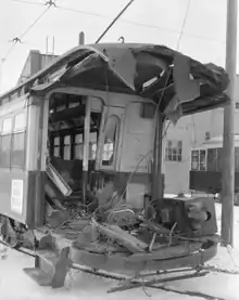 Ostrander was thrown into the passenger area of his streetcar by the force of the impact, and crushed against a wall by debris.[16] He suffered two fractured legs, multiple broken ribs, punctured organs, and lost consciousness.[17] Ostrander never regained consciousness, and died in hospital one hour after the collision, leaving behind a wife and two children[17] The passenger in Ostrander's streetcar, as well as the motorman in the other streetcar, escaped without injuries.[17] Streetcar No. 12's front end was completely missing after the crash, with wood and electrical equipment scattered on the road around the site.[16]