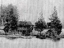 A home was constructed on the island c. the early 1900s, in which lived settlers Ira Bartholemew and Julia Bartholomew, who may have built it as a hunting lodge,[3][4] then Seattle mayor Richard A. Ballinger and Julia Ballinger during the summers, and Richard Achilles' father Col. Richard Henry Ballinger (from whom the lake the island is situated in is named for), a U.S. Civil War veteran. The Bartholomews were from Pennsylvania and homesteaded the lake island in 1862[5] – "perhaps, the only homestead of its kind in the entire country" – requiring the United States government to re-survey the land which did not exist in official records.[6] A land patent was issued in 1902.[5] At one time, a wooden bridge linked the west shore to the island.[7]