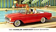 Other notable achievements included the revamped 1955 Nash Rambler that became the 1958-1960 Rambler American (first generation). As president of AMC George Romney made Anderson responsible "to 'resin' the entire 1961 line up while keeping the 1960 chassis."[9] The compact-sized car was "considered too bland at the time, but Anderson "dis a tremendous job."[10] With its 1961 restyle, Anderson gave the second generation Rambler American an entirely new look without any major re-tooling costs. This allowed AMC to make money in a very tight, competitive market. However, the 1961 Ambassador's "euro" facelift depressed the Rambler's premium model and was only used for one year.[5] The third generation of the compact 1964 Rambler American was also unique. It used some of the larger 1963 Classic body components, and this was also Anderson's work. He was also involved in a two or three member "Advanced Styling" section, "a heaven for speculative thinking" about cars "five, ten, fifteen years out."[5]