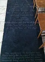 On 22 January 1771 he was confirmed as bishop of Ely. He obtained in 1772 an act of parliament for alienating from the see the ancient bishop's palace in Holborn, and for purchasing the freehold of a house in Dover Street, Piccadilly, London; the house on that site was built by him about 1776.[6] He also rebuilt most of the palace at Ely, and furnished a gallery of portraits of its bishops from the Reformation. Many of Keene's appointments to livings did him credit, and where there was no resident incumbent he reserved to himself the right of appointing to the curacies, but he did not escape hostile criticism, and the epigrams of Thomas Gray were especially severe. He died at Ely House, Dover Street, London, on 6 July 1781 and at his own desire was buried in West's Chapel, Ely Cathedral, with a short epitaph written by himself.[7]