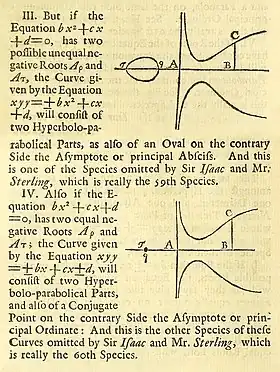 In 1736 Stone submitted a paper to the Philosophical Transactions of the Royal Society (published 1740) about two cubic plane curves not cataloged by Isaac Newton or James Stirling,[13] but unbeknownst to him the two had been previously published in 1731 by François Nicole and 1733 by Nicolaus Bernoulli, respectively.[14] In 1742 Stone submitted a 21-page paper "On Sir Isaac Newton's five diverging Parabolas", which was read to the Society but apparently never published.[15]