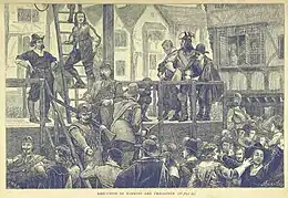 After Waller was arrested, he made a full confession, implicating a number of his co-conspirators; he escaped the death penalty, allegedly by paying bribes, while Chaloner and Tomkins were executed on 5 July 1643.[13] Many moderates were forced to disavow support for a peace settlement to avoid suspicion of involvement and reaffirm their backing for military action. After spending 18 months in prison without trial, Waller was fined £10,000 and permitted to go into exile in November 1644, accompanied by his new wife Mary; however, the affair caused lasting damage to his reputation.[9]