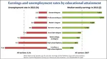 The educational attainment varied significantly among the different types of occupations. The professional/managerial fields were the only two occupational fields where college graduates with a bachelor's degree or higher represented the majority. Among professional occupations, 99.1% of the population graduated from high school, 90.2% had some college education or an associate degree and over two thirds, 68.2% had a bachelor's degree or higher.[3]