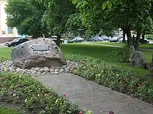 Memorial stone at the site of the main gate of the former Baranovichi ghetto. It is located at the T-shaped intersection of Gritsevets and Tsaryuk streets, behind the House of Officers.