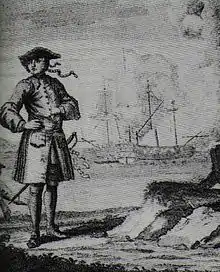 Born in Ireland as Edward Seegar sometime around 1685,[3] he was probably raised a Catholic,[4] and was said to be an educated man.[5] Seegar changed his surname to England when he turned pirate.[4] Some sources claim "Seegar" was not England's name at all, but was instead a separate pirate (Jasper Seagar) who sailed under England.[6][7] England made his way to Jamaica and during the War of the Spanish Succession he served as a privateer.[8] He was captured by the pirate captain Christopher Winter and forced to join the crew.[9] Winter took England to the pirate base on Nassau, Bahamas.[9] England took part in Henry Jennings' assault on the Spanish salvage camp at Palma de Ayz, Florida, stealing £87,000 in gold and silver.[10] England is next reported as Charles Vane's quartermaster, in March 1718. Vane's sloop, the Lark was captured by the Royal Navy, but England and the rest of the crew were released to induce the other pirates of Nassau to accept the King's pardon.[11]