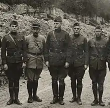 Following the American entry into the war, King was promoted to the rank of colonel in the National Army. He was the Chief of Staff of the 28th Division, a National Guard formation known as the "Keystoners," in Camp Hancock, Georgia, and also during part of its campaign in France.[5] He arrived in Europe in May 1918 and was promoted to the rank of brigadier general the following month.[2] He participated in the Marne offensive and counter-offensive starting July 15, 1918, and assumed command the 65th Brigade on July 31, 1918. He led the brigade in the battles of the Somme and Meuse-Argonne.[2] He remained with the Army of Occupation in Luxemburg from December 1918, a month after the Armistice with Germany which ended hostilities, until April 1919 and returned to the United States in 1919.[2]
