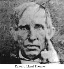 Edward Lloyd Thomas was the son of Phillip Thomas, who served as a Corporal in the Revolutionary War, and was descended from the British politician Edmund Thomas of Glamorgan.[1] and Elizabeth Covington Wailes of two prominent Maryland Families. Edward L. Thomas was a Methodist preacher (see Methodism), a planter, land speculator and surveyor. He learned surveying from his Uncle Levin Wailes. In 1808, at age 23, he was a Justice of the Peace of Franklin County, Georgia and was Captain of the Militia District 209. About 1813, he was ordained a Methodist minister, and was living at Watkinsville, Georgia in Clarke County, Georgia. Thomas was the father of Lovick Pierce Thomas, I and Edward Lloyd Thomas, grandfather of lawman Heck Thomas and Col. Lovick Pierce Thomas, Jr.