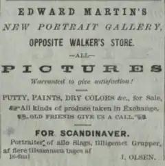 As he began his career as a photographer,[1][2][9] he also participated in various other economic activities such as selling fruit and groceries.[1] He advertised the opening of his new photography galley in July 1865.[1][6][7][9][14] The gallery was located opposite of the Walker's Store, on the west side of East temple between first and second south in Salt Lake City.[1][14] He focused primarily on portrait photography, which were printed on Cartes de visite, which were approximately the size of a business card.[1][6] He also sold other items such as fruit, confectionery, and groceries at his store.[6] He took several prominently known photographs of the new tabernacle, including a series of panoramic views of the Salt Lake Valley from the top of the tabernacle in 1867.[1] By early 1874, advertisements for his photography business largely disappeared from local newspapers and city directories,[1][6] likely due to competition from other prominent photographers in the region.[1]