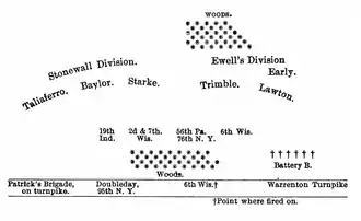 After nearly two hours under fire, they retreated to their trenches.[3]: 474 In his report of the battle, their division commander, General Lysander Cutler, said, "In this affair I lost in killed and wounded about one third of the men I had with me, and among them many valuable officers." He continued to say that they never reached within seventy five yards of the enemy lines.[6]: 291