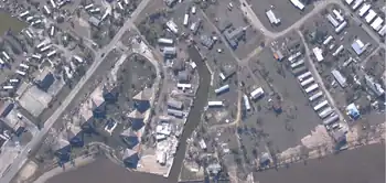 At Lake Harbor, a tiny lakefront community near the western boundary of Palm Beach County, only seven homes were left standing after the hurricane.[95] About 743 homes[92] – roughly 80% of the dwelling in South Bay – were damaged,[93] and 63 residences were destroyed.[92] The city hall and the fire station suffered heavy roof damage.[96] In Canal Point, trees, branches, power lines, and electrical poles were toppled. Almost complete destruction of the community's mobile homes parks occurred. Several other homes and buildings were inflicted with serious damage.[89] Overall, damage occurred at about 60% of homes in Canal Point.[94] Some historical buildings damaged by hurricanes Frances and Jeanne in 2004 were destroyed by Wilma.[97] State Road 80, one of the only routes between eastern and western Palm Beach County, was closed after a Florida Power & Light transmission line fell across the highway about 1 mi (1.6 km) west of Lion Country Safari.[91] At the Loxahatchee National Wildlife Refuge (NWR), 85% of tree islands – "small, wetland forest communities imbedded in a matrix of freshwater marsh" – were damaged by the storm. Less than 50% of the canopies were removed at most tree islands, while the tree islands that suffered the worst impact had larger trees and were near the center of Loxahatchee NWR.[98] The office and visitor centers were both severely damaged and later rebuilt.[99]