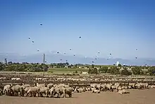 Livestock is fed either by letting them directly graze forage from pasture, or by growing crops like corn or soybeans for fodder. Both are highly important; the majority of soybeans are grown for fodder, while a third of croplands worldwide are devoted to forage, which feeds around 1.5 billion cattle, 0.21 billion buffalo, 1.2 billion sheep and 1.02 billion goats.[23] Insufficient supply or quality of either leads to a decrease in growth and reproductive efficiency in domestic animals, especially in conjunction with the other stressors, and at worst, may increase mortality due to starvation.[24] This is a particularly acute issue when livestock herds are already of an unsustainable size. For instance, two-thirds of animal feed requirements in Iran come from its rangelands, which cover around 52% of its land area, yet only 10% have forage quality above "medium" or "poor". Consequently, Iranian rangelands support over twice their sustainable capacity, and this leads to mass mortality in poor years, such as when around 800,000 goats and sheep in Iran perished due to the severe 1999 − 2001 drought. This was then exceeded by millions of animal deaths during the 2007–2008 drought.[25]