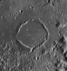 Egede is the remains of a lunar impact crater that has been flooded by lava, leaving only the somewhat polygonal circumference of the rim protruding just above the mare. It was named after Dano-Norwegian natural historian Hans Egede.[1] It is located on the southern edge of the Mare Frigoris, to the west of the crater Aristoteles. To the southwest is an arc of low mountains curving between the rims of Aristoteles and Eudoxus. The floor of Egede is flat and nearly featureless, except for a few tiny craterlets, including secondaries from Aristoteles (which are also present to the north and south of Egede). The surviving rim has a maximum altitude of 0.4 km above the surface.