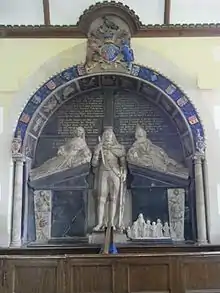 In the 16th century the male line of Reigny died out, and Anne Reigny (daughter and sole-heiress of Richard Reigny) brought the manor to the family of her husband, Charles Copleston of Bicton.[2] Their son was John I Copleston (died 1586), who is recorded as patron of the church in 1571. As a mural tablet in Eggesford Church records, his son John II Copleston (died 1606),[3] who witnessed a land settlement at Winkleigh in 1589, married Dorothy Beeston (died 1601), the daughter of Sir George Beeston (c. 1520 – 1601) of Beeston House near Bunbury, Crewe, Cheshire, who acquired Beeston Castle from the Crown shortly before his death. He was a naval captain who commanded HMS Dreadnought against the Spanish Armada in 1588, and was knighted at sea on board the Ark Royal by Lord Howard of Effingham the Lord High Admiral. He served as MP for Cheshire in 1589. His wife, and Dorothy's mother, was Alice Davenport (died 1591), daughter of Thomas Davenport Esq., of Henbury. Sir George's effigy and elaborate monument exists against the north wall of the sanctuary in St Boniface's Church, Bunbury.[4] The tablet in Eggesford Church is inscribed as follows:
