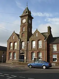 The new town hall was designed in the Gothic Revival style, built in fine sandstone at a cost of £5,000 and was completed in 1890.[6] The design involved an asymmetrical main frontage with five bays facing onto Main Street; the central bay was formed by a five-stage clock tower with a doorway with a fanlight in the first stage, a segmental window in the second stage, a segmental niche in the third stage, a belfry in the fourth stage and a series of clock faces in the fifth stage: the tower was surmounted by a pyramid-shaped roof. The two outer bays on the left were surmounted with a gable, as were the two outer bays on the right: the outer bays were fenestrated by pointed windows on the ground floor and segmental windows on the first floor. Internally, the principal room was the office for the local board.[3]