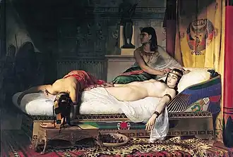 Most ancient sources attribute the deaths of the Egyptian queen Cleopatra and her two handmaidens to the bite of an Egyptian cobra after the fall of Egypt to Octavian. The snake was reportedly smuggled into her chambers in a basket of figs. Plutarch wrote that Cleopatra had experimented on condemned prisoners with various poisons and snake venoms, finding aspis venom to be the most painless of all fatal toxins.[23] In Ptolemaic Egypt, the term "aspis" (an ancient Greek word referring to a wide variety of venomous snakes) was most likely an Egyptian cobra. This aspect of her apparent suicide has been questioned in recent years, as the relatively large size of the snake would have made it difficult to conceal, and because Egyptian cobra venom is slow-acting and does not always cause death.[24]