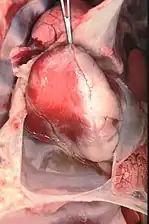 Oedematous pericardium of a goat that died of heartwater disease, caused by infection with Ehrlichia ruminantium, transmitted by Amblyomma ticks in Africa and Caribbean